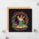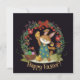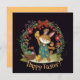 Le mignon lapin de Pâques et les poulets carrés sont entourés d'éléments floraux avec un panier d'oeufs et le lapin tenant un poulet dans la main. C'était soigneusement travaillé, peint à la main. L'Arrière - plan est noir à l'avant et jaune à l'arrière de la carte. Joyeux Pâques !