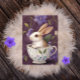 Illustration adorable d'un bébé lapin assis à l'intérieur d'une délicate teacup florale, entouré de fleurs mauves douces. Parfait pour les amoureux des animaux, les occasions de printemps ou les collectionneurs de cartes d'art mignonnes.