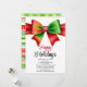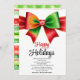 Large red, green bow and stripes Christmas holiday card. The front of the card prominently features an impressive large red and green coquette bow, centered with a delicate snowflake. The cheerful phrase "Happy Holidays" is written in bold script typography. The back reveals an appealing pattern of irregular red and green stripes, playfully scattered with snowflakes.