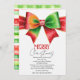Large red and green bow and stripes Merry Christmas holiday card. This festive Christmas holiday card features a classic red and green design. The front is dominated by a large, impressive coquette bow, centered with a delicate snowflake detail. The phrase "Merry Christmas " is written in script and decotarive typography. The back of the card features an appealing pattern of irregular red and green stripes scattered playfully with snowflakes.