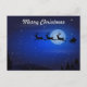 Joyeux salut de Noël. Illustration festive de Noël de père Noël dans son traîneau et son renne volant à travers le ciel bleu nuit foncé. Une lune éclatante illumine le ciel et on peut voir des étoiles scintillantes tout autour. Des arbres et des montagnes peuvent être vus sur la terre en contrebas.
