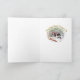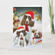 Épagneul de springer anglais de fête dans la vitesse de vacances contre un contexte de neige d'hiver dans cette carte de Noël de conception de Friskybizpet.