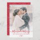Élégant script rouge moderne jeunes mariés Photo Marié et Joyeuse carte de Noël. Ce simple minimaliste festif whimsical (1) une photo de vacances carte de voeux modèle caractéristiques "Marié et Joyeux" texte de salutation est écrit dans une belle main lettré tourbillonnant swash-tail police calligraphie ou typographie rouge script, nom du couple et année sur la couverture photo dégradé blanc. Sur l'envers motif de neige ou de flocon de neige sur arrière - plan rouge. Jolie carte de voeux pour votre famille et vos amis pendant la période de Noël.