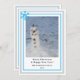 Merry Christmas and Happy New Year. Insert Name and Year in black typography. Cute little snowman. Festive gray and blue snowflakes elements and geometric border. Greeting typography on backside. Original Photography Design by TamiraZDesigns.