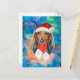 Le Noël du chien de la race Long Haired Dachshund présente une aquarelle d'un Dachshund avec un Casquette Père Noël rouge, un foulard de Noël rouge et une aquarelle galaxie.