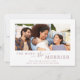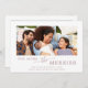 Cet or rose minimal, plus la carte de faire-part de naissance plus merrier est la parfaite simple salutation de vacances. Le design est composé d'une typographie classique rose vif et blanche associée à une police de caractères rustique mais élégante avec style lettré à la main. Personnalisez la carte avec votre photo de famille, les noms et l'année sur le devant et votre bébé faire-part de naissance sur le dos.