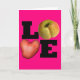 Carte de voeux Valentine's Day avec pomme de terre, pomme et grand lettrage "LOVE" en noir sur arrière - plan rose. Complétez vos achats de cartes de vacances avec le timbre postal correspondant.