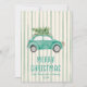 Si vous cherchez une carte de Noël simple minimaliste, belle et facile à modifier. Celui-ci est parfait pour vous. Et comme vous voyez le design présente un camion vert vintage avec un arbre, Et de la typographie de MERRY CHRISTMAS écrit à la main en beige et vert. Et votre nom de famille et l'année sous lui. Et dans le dos vous avez un paragraphe de voeux de Noël personnalisable et des lampes colorées rayées. Le tout sur des rayures crème et verte arrière - plan.