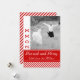 Un carte photo plat de Noël marié et joyeux rouge, rayures blanches et moderne avec votre photo mariage, une bande rouge avec des rayures blanches le long, des rayures rouges en diagonale, des rayures blanches et le texte "Marié et Joyeux", "2014" et votre nom de famille. Au fond, un motif rayé rouge et blanc. Cette carte de vacances branchée et branchée est entièrement personnalisable. Personnalisez-le avec votre texte. Une carte moderne à envoyer pour les voeux de Noël de la première saison. Remplacez le texte par "Marié et brillant" ou utilisez-le pour les souhaits de la nouvelle année.