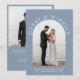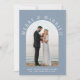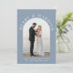 Elégante carte de Noël bleu mariage poussiéreuse pour les jeunes mariés avec votre photo dans une arche, "Merry & Married" dans la typographie classique blanche serif, et votre salutation de vacances, noms et l'année dans la simple typographie blanche moderne. Ajoutez une photo supplémentaire au dos, votre message personnalisé à la famille et aux amis, et vos prénoms dans un script signature.