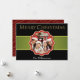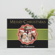 Une carte de Noël attrayante et attrayante avec votre photo de famille mise en valeur par médaillon et ruban de Noël. Joyeux Noël dans un or pétillant en haut et vos noms près du bas. Backside présente un motif répétitif de l'or Joyeux Noël contre un rouge foncé.