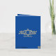 Une carte de vœux moderne de Hanouka or et bleu représentant une belle menorah dorée scintillante avec une colombe volante sur un fond bleu foncé riche avec des graphismes enroulés à l'intérieur et au dos de la carte. Souhaitez à vos proches amour, lumières et latkes avec cette élégante carte de vacances de Hanouka.