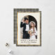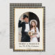 Elegant Merry and Married Arch Wedding Photo Holiday Card. Celebrate your first holiday season as newlyweds with this elegant arch photo card. The front features a modern “Merry and Married” typography, complete with your family name in a hand-lettered script and year. On front framed in a chic black and faux-gold plaid pattern. The back showcases a coordinating black and gold plaid pattern for a timeless, festive touch. A perfect way to share your joy and newlywed holiday cheer with loved ones.