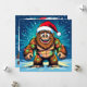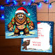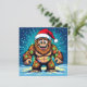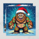 A funny sasquatch Christmas card with a personalized message. Comic book style pop art bigfoot smiling with a Santa and Christmas lights on.