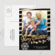 This Christmas postcard fea customizable photo frame, a black and gold striped background and the text: Merry Christmas & Happy New Year. The postcard is accented with two white snowflakes near the bottom. Customizable text on the front allows you to add your family names and customizable text on the back allows you to add a personnels.