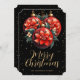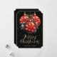 Elegant black and gold Christmas card featuring red floral Christmas ornaments against a starry background.