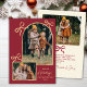 Modern Gold Bows and 3 Photo Happy Holidays Gold Arch Burgundy Red Christmas Holiday Card. Celebrate the season in style with this elegant family photo Holiday card featuring a modern gold color arch-shaped photo frame with boho cute gold coquette bows accents. Personalize it with your favorite family photos, family name, and the year on deep red or burgundy red background. The festive design is highlighted with elegant faux-gold color "Happy Holidays" calligraphy text, creating a warm and timeless look. The back showcases holiday message template with hand lettered name and one family photo on ivory or beige background. A perfect holiday card to share with family and friends in winter holiday season.