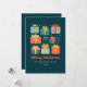Send heartfelt holiday wishes with this charming flat Christmas card featuring a festive array of illustrated gift boxes in warm red, gold, and green tones. The front reads “Merry Christmas” in elegant script lettering, which can be personalized with your family name and year for a unique, modern touch The back includes a customizable message to share your joy and love this season.