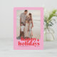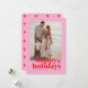 Une carte de vacances photo moderne et lumineuse avec une typographie audacieuse en rouge sur un fond rose coloré avec un motif d'étoile rouge au verso. La photo, le nom et l'année peuvent être facilement personnalisés pour un effet personnel. Un design de Noël amusant, coloré et contemporain pour se démarquer cette saison des fêtes !