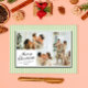 Petites rayures verticales crème et vert menthe donnent à cette trois carte de vacances photo une ambiance moderne et chic lorsqu'elle est jumelée à des polices classiques en noir. Le backer coordonné comprend un message plus long personnalisé de soutien et de mise à jour pour l'année qui est parfait pour envoyer à des amis et à la famille.