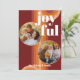 Carte de voeux de Noël classique contemporaine avec rouge clair et foncé, corail et pastel pêche orange motif abstrait couleur orange avec véritable feuille d'or JOIE texte de souhait. Avec de la place pour customiser ou personnaliser avec deux photos, un nom de famille (ou des noms individuels) sur le devant, et un message de bienvenue de saison personnalisable sur le côté arrière de la carte.