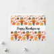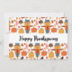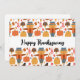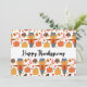 Carte d'action de grâce avec un motif d'automne saisonnier, maïs, champignons et flore. Avec des dindes et des épouvantails pour honorer la tradition Thanksgiving.