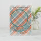 Unique, classique, mignonne et décorative Carte de voeux de la saison des Fêtes. Avec plaisir Bon thanksgiving souhait sur une chaleureuse et chaleureuse couleur turquoise bleu et orange rouge plaid motif. Avec de la place pour customiser ou personnaliser avec votre propre photo joyeuse et nom de famille sur le devant de la carte, et un poème de bienvenue de saison personnalisable sur le côté arrière de la carte avec option pour les noms de membres de la famille.