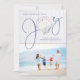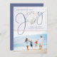 Nautique Noël Joy Seashell Holiday Photo avec un coquillage rustique comme le "o" dans Joy sur un arrière - plan de bois blanc côtier, avec texte bleu bord de mer. Facile d'ajouter votre photo et les détails pour une carte de Noël amusante!