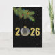 Ornement de Noël Gold 2025 accroché à une touffe de pin sur un arrière - plan noir aux flocons de neige. La couleur Arrière - plan peut être modifiée.