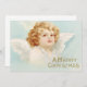 Un ange avec une tête dorée de boucles et portant une robe blanche regarde vers le ciel. Texte : "Un joyeux Noël." Parfait pour les cartes de Noël !