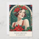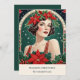 Cette carte de Noël rétro présente l'image d'une élégante dame aux fleurs de poinsettia rouge, dans un style d'inspiration Art Déco. En dessous de l'image se trouve le message "Bonnes Fêtes et la carte peut être personnalisée avec votre ou vos nom(s). Le verso de la carte est un vert foncé saisonnier.