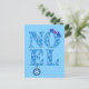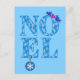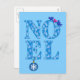 Carte postale avec le "Noel" de bienvenue, à l'image des arbres de Noël rétro et modernes, dans les tons bleu glacé, orné d'une sainte griffe et d'un ornement de flocon de neige