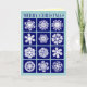 Une carte de Noël avec douze motifs de flocon de neige dans des carrés bleu-foncé sur un arrière - plan de vert de cool de lumière, légèrement marbré. Joyeux Noël au dessus dans les capitales écrites dans une police sensible de style d'empattement. "Joyeux Noël et une bonne année" écrite à l'intérieur sur un arrière - plan jaune pâle. (L'intérieur de message peut être customisé).
