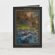 Belle carte de Noël de moulin boisé au bord d'un ruisseau avec une bordure noire et dorée. Personnalisez le message. Créé par Kathy Kelly depuis https://3-kathy-kelly.pixels.com/.