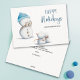 Carte de vacances bleu adorable avec l'illustration d'un bonhomme de neige prenant des photos. Illustré et dessiné par Patricia Alvarez.