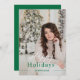 Personnalisez ce modèle simple et élégant avec votre photo et votre nom. Caractéristiques de design "Happy Holidays" dans le texte de script élégant moderne en blanc et vert sur une photo superposition sur votre photo préférée avec la couleur verte festive au dos de la carte