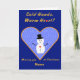 Une carte de noël pour personnaliser avec un nom. La carte comporte un dessin d'un bonhomme de neige souriant avec un casquette noir et des bâtons pour les bras ("mains froides"), des yeux et des boutons de charbon noir, et un coeur rouge brillant ("coeur chaud"). Il se dresse contre un arrière - plan bleu pâle et enneigé, à l'intérieur d'un cadre cardiaque doré entouré de bleu royal. Vous pouvez aussi customiser le verset intérieur : "Il fait froid dehors Et le froid de l'hiver apporte de la glace et de la neige. Je pense à toi, mon coeur bat chaleureusement, fonce la neige."