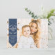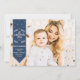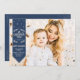 Carte de voeux de Noël simple et élégante avec une image de famille personnalisable avec une bannière moderne en bleu indigo recouverte d'une belle lettrage en ivoire qui lit It'Chrismas Time, décorée de verdure et de jolis flocons de neige. Ajoutez facilement vos propres photos, noms, année et salutations en éditant le modèle