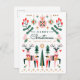 Un design symétrique charmant avec deux rennes ornés de motifs géométriques, entourés de petits arbres et d'ornements de fête. L'utilisation de teintes roses, vertes et rouges crée une scène de Noël fantaisiste et d'inspiration nordique avec des éléments de nature stylisés et des formes festives traditionnelles.