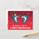 Cartes postales avec texte de typographie personnalisée requins de Noël dessin animé sur fond rouge.