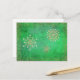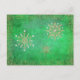 Cette carte postale comporte trois flocons d'or parsemés de strass clairs nichés sur un arrière - plan vert. Un gâchis sucré de parties scintillant d'or tout encadre.