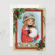 Vintage Christmas card showing a little girl wrapped up thermly with hands in white muff. She carries a doll and a book and has a sprig de holly.