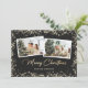 Cartes de Noël avec un faux titre de police calligraphie de feuille d'or et des lumières magiques de Noël brillantes sur le devant et un arrière - plan de buffle noir et blanc à l'arrière. Personnalisez facilement cette carte de Noël scintillante avec vos photos et votre nom de famille.
