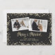 Un buffle noir et blanc éclatant plaçait la carte de Noël des jeunes mariés avec un titre de police calligraphie, la neige dorée, les étoiles, lumières magiques de Noël brillantes et deux photos sur un arrière - plan noir. Personnalisez facilement cette carte de Noël scintillante avec vos photos et le nom de famille.