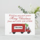 C'est une carte de Noël plutôt humoristique pour une entreprise qui a déménagé et qui souhaite informer ses clients de sa nouvelle adresse. Un camion de déménagement a un petit sapin sur le toit de la cabine, et la guirlande vole derrière.