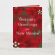 Un design graphique de poinsettias rouges sur une carte de voeux de Noël. La carte contient les Joyeuses Fêtes de texte du Nouveau-Mexique. Il a un verset personnalisable à l'intérieur. OEuvre originale : Copyright Charmaine Paulson