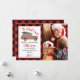 Illustration d'un SUV camion rouge à panneaux de bois transportant un sapin de Noël vivant. Texte personnalisé. Personnalisez avec votre propre photo à droite. La bordure et le côté opposé sont un motif à carreaux rouge et noir buffalo plaid.