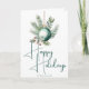 Cette magnifique carte de Noël de typographie verte présente une belle aquarelle d'un ornement de vacances et de feuilles de pin au-dessus de l'élégant script écrit à la main lire Happy Holidays. Cette carte de vacances moderne sans photo pliée comprend votre lettre de famille personnalisée à l'intérieur.