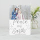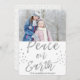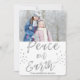 Paix sur Terre Carte photo de Noël blanc et argent. L'image et le nom de famille peuvent être remplacés sur la Carte de Noël Paix sur Terre blanche et argent.