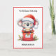 Envoyez un sourire cette saison des fêtes avec cette adorable carte de Noël représentant un koala joyeux avec un chapeau de Père Noël ! Assis au sommet d'une boîte aux lettres rouge festive décorée de lumières de Noël et de houx, ce design est parfait pour répandre la joie et le rire. Avec le message ludique "Koala La La La !" et "'C'est la saison d'être joyeux", c'est idéal pour tous ceux qui aiment les cartes de Noël mignonnes et fantaisistes. Un choix charmant pour les amoureux des animaux, les amis ou la famille !